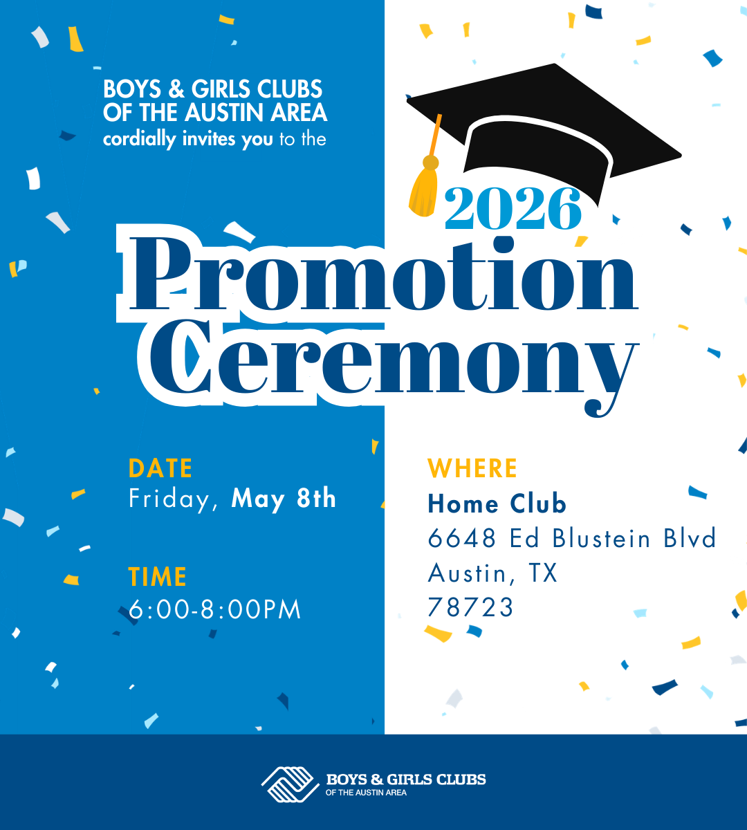 Join us for a special celebration honoring our 8th and 12th grade Club members as they graduate and step into their next chapter! On May 8th from 6:00 PM – 8:00 PM, BGCAA will host the Promotion Ceremony to celebrate our graduating Club members at Home Club on the Sheth Family Campus.
